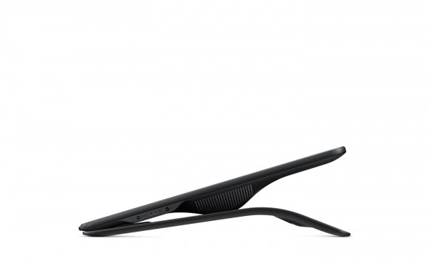 In our Samsung Galaxy View review, we found that it gives an uncanny reminder of a plastic binder clip. The supplementary panel on the back is flat on the back until you reach the top quarter of device. It rotates about 45 degrees at a point. The slightly curved part of the panel houses a handle that is oval shaped in the middle, which is fixed via hinges made of plastic. It can be settled in two different positions, the first one allows the tab to stand upright and the second one allows it to lay down at a specific angle and also allows easy transportation of tablet by releasing handle. The inbuilt stand is utilitarian, but it feels wonky and cheap.